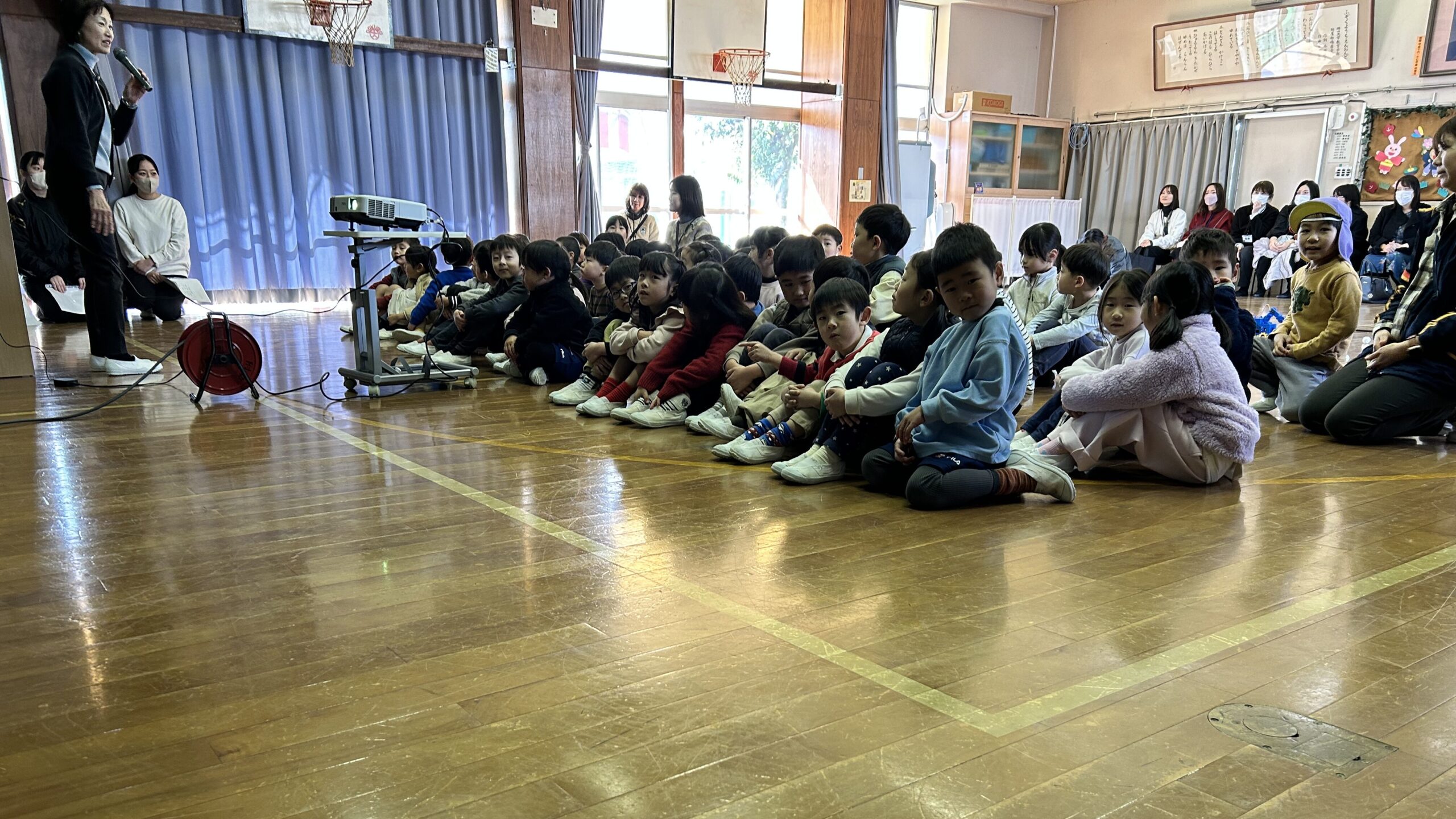 年長の園児43人に参加してもらいました。こちらからの問いかけに積極的に答えてくれ、ワークショップに活気が生まれます。